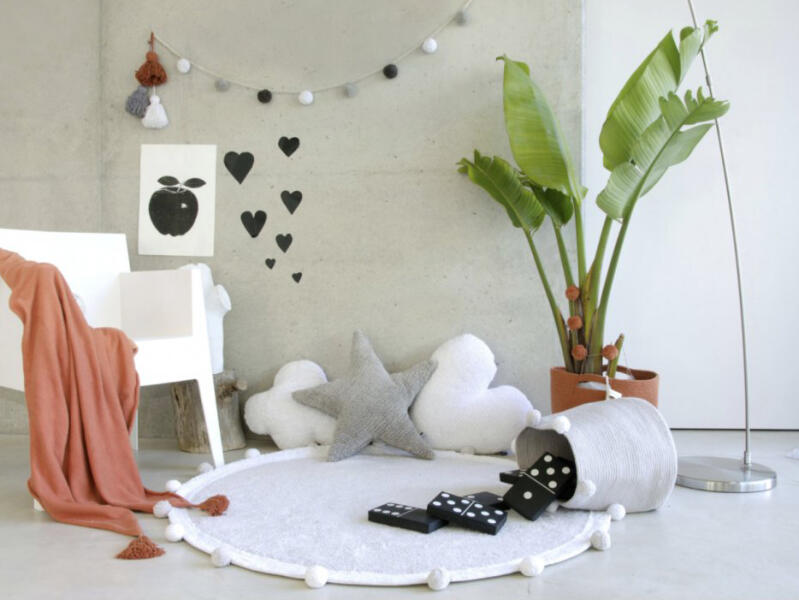 BUBBLY 120x120 gyerekszőnyeg egy szürke szőnyeg fehér szegéllyel és a szélén pompomokkal. 100% pamutból készült. A szőnyeg az elegáns és finom pasztell színeinek köszönhetően tökéletesen illik egy kislány vagy egy kisfiú szobájába is. A szőnyeg kézzel készült, és előállítása során csak természetes színezőanyagokat használtak, ezért teljesen biztonságos a gye
