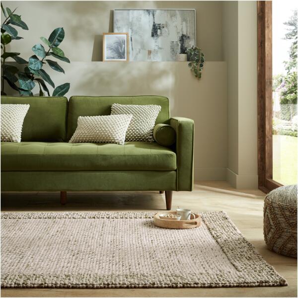 Flair Rugs Bobble Wool Border téglalap alakú szőnyeg, 120 x 170 cm, 2000 g/m2, 82% gyapjú, 18% poliészter, Zöld Az indiai kézművesek által kézzel szőtt Pebble Border gyapjúszőnyeg bóbitás hatást kombinál a félig áttetsző szegélyrészletekkel, ami finom és elegáns padlóburkolatot eredményez. A 82% gyapjúból készült Pebble Border Wool Rug természetes hang- és hősziget