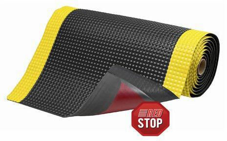 Sky Trax® nagy teherbírású ipari fáradásgátló szőnyeg, fekete színű, sárga szegéllyel. ellenálló laminált felület ergonomikus buborékmintával a fokozott kényelem érdekében állás közben. Csúszásmentesség és szabad mozgás: R9 tesztelve a DIN51130 és BGR181 szerint. RedStop csúszásgátló bevonat a szőnyeg biztonságos rögzítése érdekében.