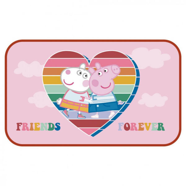 Peppa Pig mintás szőnyeg Remekül fog mutatni a fürdőszobában kilépőként, de használható szobai lábtörlőként is. Biztonságos, és nagyon fontos, hogy a gumis aljának köszönhetően, nem fog csúszkálni a parkettán, padlón. Anyaga: 100% poliészter Méretek 40x70cm