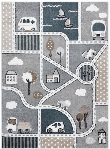Fehér kék és szürke színű hőlégballonos gyerekszőnyeg. Vidám, játékos hangulatú szőnyeg. Visszafogott színvilága hozzájárul a gyerekszoba harmonikus megjelenéséhez. A vidám állatkák látványa a gyermekeket játékra ösztönzik. Átmérő: 160 cm Szálösszetétel: 100% polipropilén frisé szál Hátlap:Természetes juta