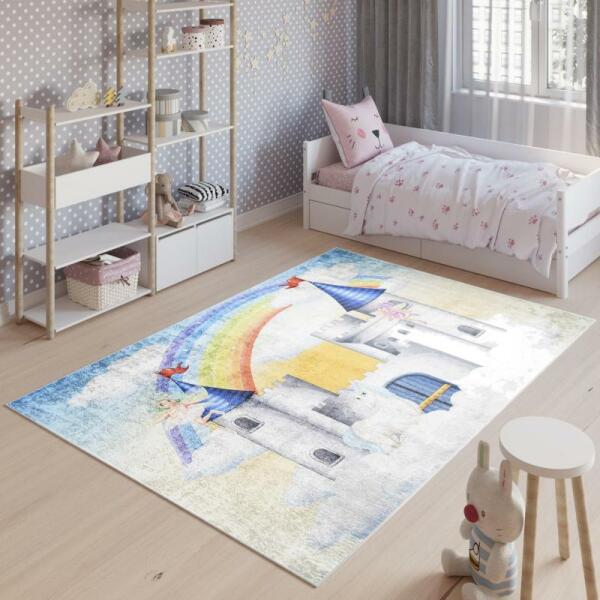 Színes szőnyeg, mesebirodalommal, minőségi anyagból és a legújabb divattrendek szerint tervezve.