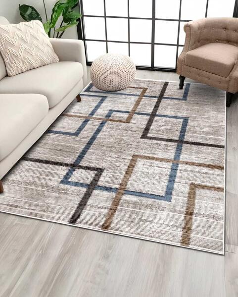 Bemutatjuk ezt a modern szőnyeget, amely geometrikus mintájával újradefiniálja a modern eleganciát a kék, barna és krém elegáns árnyalataiban. Ezt a stílusos darabot úgy tervezték, hogy kiegészítse a különböző dekor stílusokat, így ideális választás nappaliba, hálószobába és irodába egyaránt. Kiváló minőségű szintetikus szálakból készült, plüss textúrát