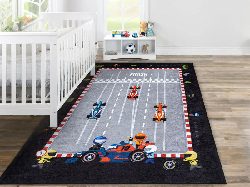 Engedje meg, hogy bemutassuk az Autóversenyző gyerekszőnyeget versenyautókkal, amely tökéletes kiegészítő minden fiús gyerekszobába a kis autóversenyzőknek. Gyermeke egyszerűen imádni fogja. A szőnyegen autóversenyzők és Forma-1-es autók is láthatók, melynek köszönhetően a gyerekszoba egy versenypályává alakul. A szőnyeg 100 % poliészterből készül, így nagyon hoss