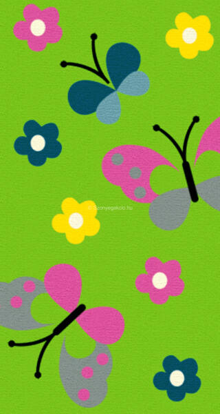 Színes, vidám pillangós szőnyeg zöld alapszínnel. Puha tapintású, kellemes érintésű szőnyeg, melyen a gyermekek szívesen játszanak. Száltípus: friese szőnyeg Súly: 2000 gr/nm Anyag: 100% polipropilén - Antiallergén - Padlófűtés esetén is használható - Könnyen kezelhető - Tartós szín Kereskedelmi forgalomban kapható általános szőnyegtisztító készítménnyel vagy