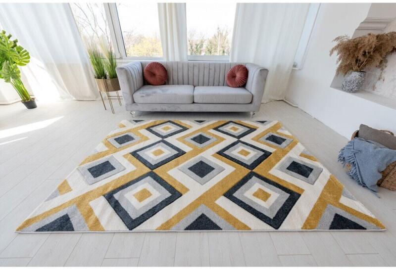 Gyönyörű színes geometrikus mintával díszített szőnyeg, amely 1500 g/m2 sűrűségű szövéssel és 6 milliméteres szálhosszúsággal rendelkezik. A szőnyeg nagyon puha és rugalmas szálakból áll, amelyek ellenállóak a kikopással szemben. A szőnyeg nagy előnye az egyszerű karbantartás. A színes szőnyeg tökéletesen feldob minden szobát, legyen szó a hálószobáról, nap