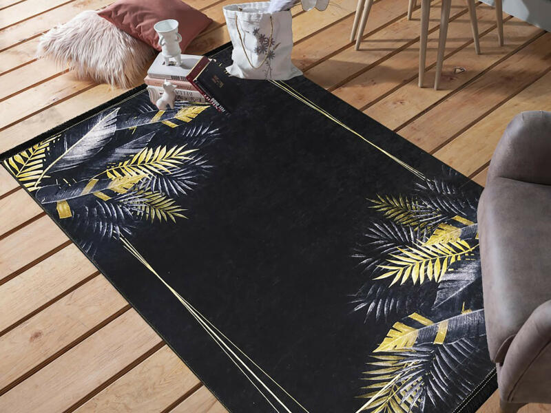 Elegáns arany - fekete LEWY szőnyeg, amely egy csúszásgátlóval ellátott egyedi szőnyeg. Tökéletes kényelmet biztosít a puhaságának köszönhetően. A modern szőnyeg tökéletesen beillik minden szobába. Az stílusos trópusi levél minta mindenkit levesz majd a lábáról első látásra. A fekete szőnyeg a legjobb minőségű anyagokból készül, melynek köszönhetően nagyon s