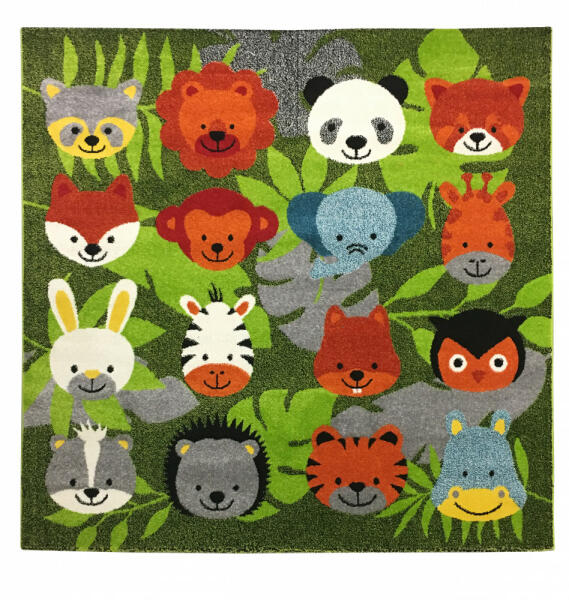 Színes, vidám állatfej mintás szőnyeg. Puha tapintású, kellemes érintésű szőnyeg, melyen a gyermekek szívesen játszanak. Száltípus: friese szőnyeg Súly: 2000 gr/nm Anyag: 100% polipropilén - Antiallergén - Padlófűtés esetén is használható - Könnyen kezelhető - Tartós szín Kereskedelmi forgalomban kapható általános szőnyegtisztító készítménnyel vagy szappanos v