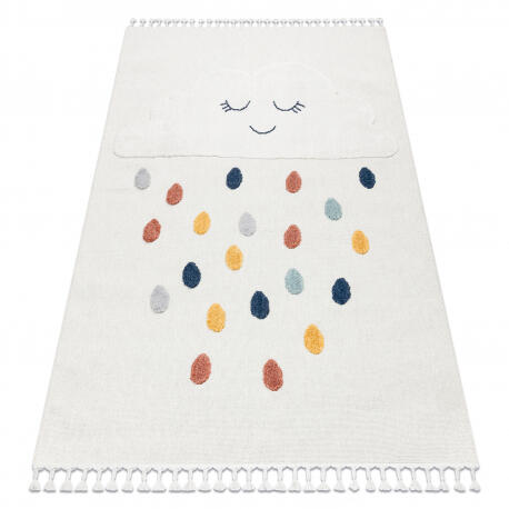 Élénkítse fel a gyerekszobát a Chmurka struktúrált szőnyegünkkel, amely játékosságot és kényelmet hoz a térbe. Ez a téglalap alakú szőnyeg kiváló minőségű poliészterből készült, ami biztosítja annak tartósságát és könnyű karbantartását. A finom fehér és gránát színeknek, valamint a vidám felhő és csepp motívumoknak köszönhetően kedvenc játszóhelyév