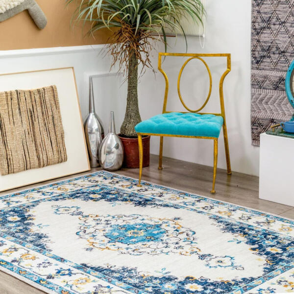 Bemutatunk egy kifinomult szőnyeget, amely az időtlen eleganciát feltűnő virágmotívumokkal ötvözi! Mélykék, krém és rózsaszín árnyalatok gazdag színpalettájával ez a szőnyeg mélységet és karaktert kölcsönöz minden helyiségnek. Tartós, szintetikus szálakból készült, fényűző érzést és tartós rugalmasságot kínálva, így tökéletes olyan nagy forgalmú helyek