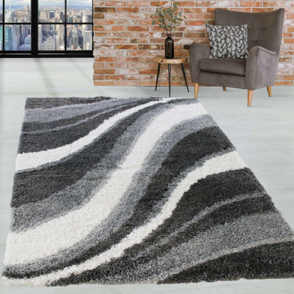 Modern, szürke-fehér szőnyeg, mintával, kiváló minőségű anyagból és a legújabb divattrendek szerint tervezve.