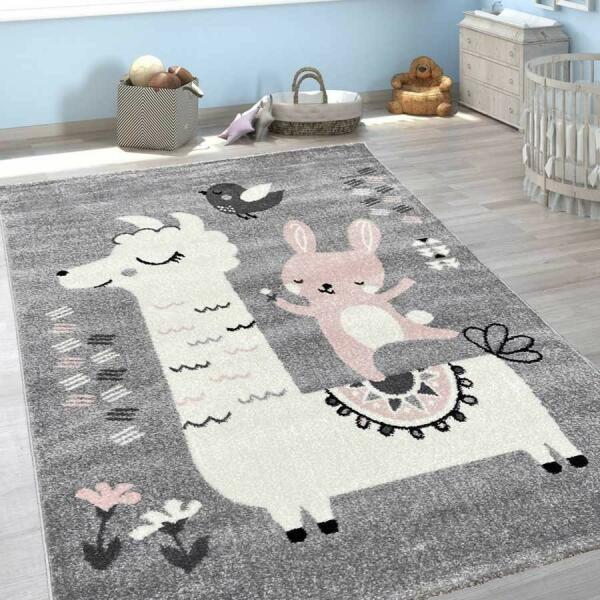 A Pasztel gyerekszőnyeg H199A_SFI23 egy igazán aranyos, nyuszi és láma mintázattal díszített szőnyeg, amelynek pasztelszürke színe remekül illeszkedik a gyermekszoba enteriőrjébe. A szőnyeg mérete 160x230 cm, amely ideális méretet biztosít a kicsik számára játékhoz, kényelmes pihenéshez és játszóterületként is szolgál. Amellett, hogy a gyerekeknek biztosítja a kellem