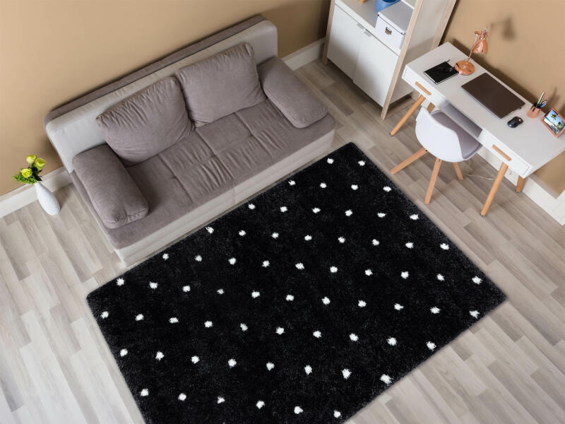Engedje meg, hogy bemutassuk Önnek ezt az elbűvölő Febie pöttyös szőnyeget. A fekete színének és az aranyos fehér pöttyöknek köszönhetően elbűvöl majd mindenkit. Ez a téglalap szőnyeg nem csak felnőtteknek, de a gyerekeknek is megfelelő a gyerekszobába. A Febie szőnyeg 100 % pamutból készül és 5 cm hosszú puha és rugalmas Shaggy szálakból áll, amely garantálja maj