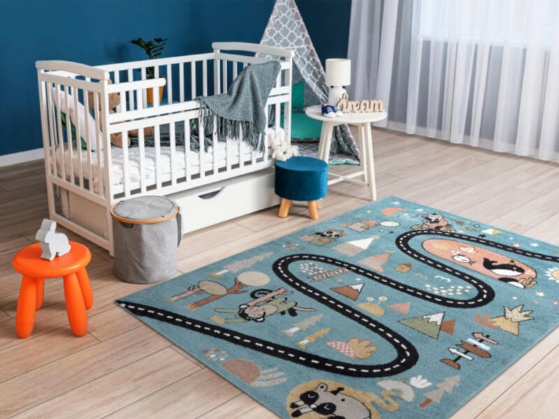 Kék színben készült aranyos állat mintás gyerekszőnyeg, amely egy erdőn keresztül vezető utat ábrázol. A praktikus közlekedés szőnyeg tökéletes választás minden gyerekszobába, főleg a fiús gyerekszobákba a kék színe miatt. Minőségi 100 % polipropilénből készült, amely megvédi a gyerekeket a hideg padlótől. 1800 g/m2 sűrűségű Soft Frisé típusú 8 mm magas sz