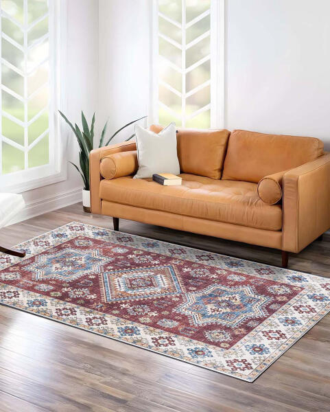 Bemutatjuk hagyományos bohém stílusú szőnyegünket – élénk kiegészítője minden helyiségnek! Ez a szőnyeg magával ragadó geometriai mintával, élénk piros, kék és elefántcsont tónusokban, tökéletes, hogy melegséget és stílust varázsoljon nappalijába, hálószobájába vagy irodájába. Kiváló minőségű, könnyen kezelhető anyagokból készült, így tartósságot