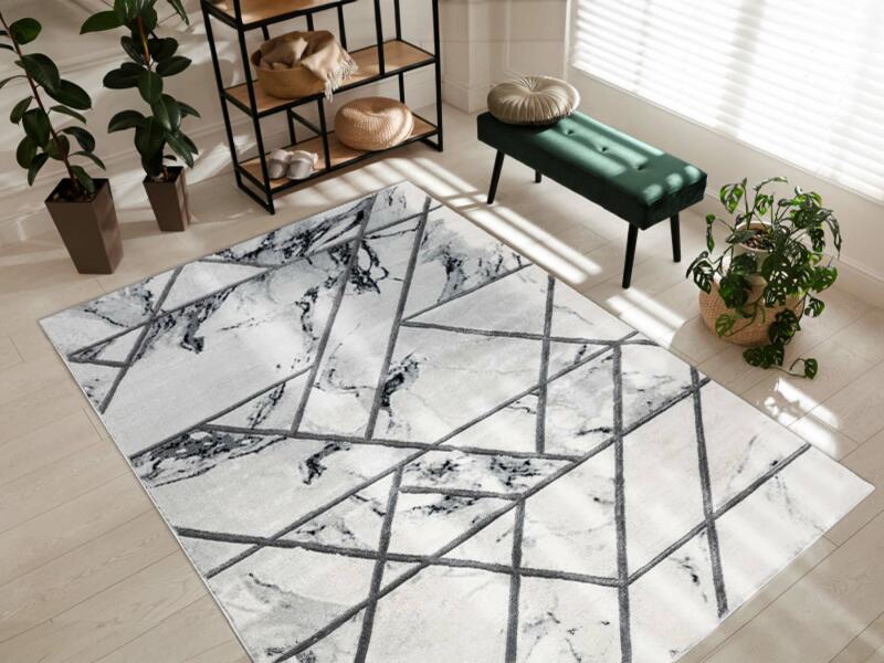 Amennyiben modern stílusban van berendezve a nappalija, akkor tökéletes választást jelent ez a gyönyörű és kellemesen puha DELAN szőnyeg. A szürke-ezüst színeinek és a márványos mintának köszönhetően egy kis luxust és eleganciát csempész mindenhová. Közepesen hosszú szálhosszúságának köszönhetően igazi kényelmet garantál, de ezenkívül könnyen tisztítható is