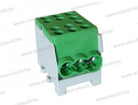 1 pólusú Oldalanként 3-3 ónozott furattal: 2x35mm2 és 4x25mm2, így nem csak réz, hanem alumínium vezeték is beköthető Beköthető vezetékméret: 2x10-35mm2 be-, 4x1,5-25mm2 leágazó DIN 35 mm-es sínre szerelhető. XBS FVKO 35/25mm2 - szürke (fázisvezetők kötésére) - kék (nullavezetők kötésére) - zöld-sárga (földeléshez)