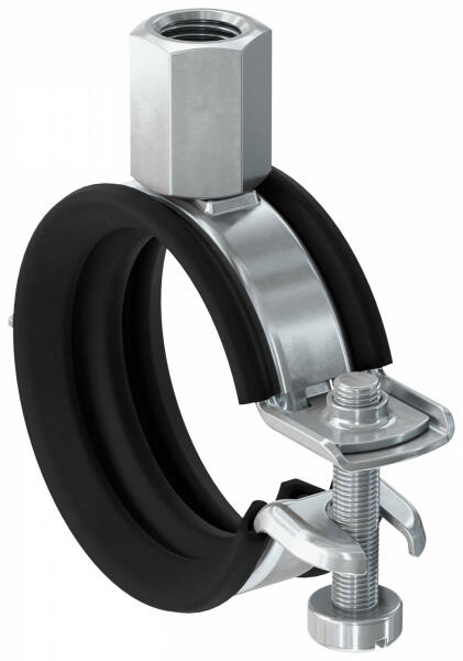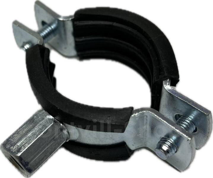 Gumibetétes könnyűfém csõbilincs. Felhasználható épületgépészeti célokra, csõvezetékek megfogatására. A gumis bilincset M8-as vagy M10-es csavarokkal (ászokcsavarokkal) lehet felfogatni.