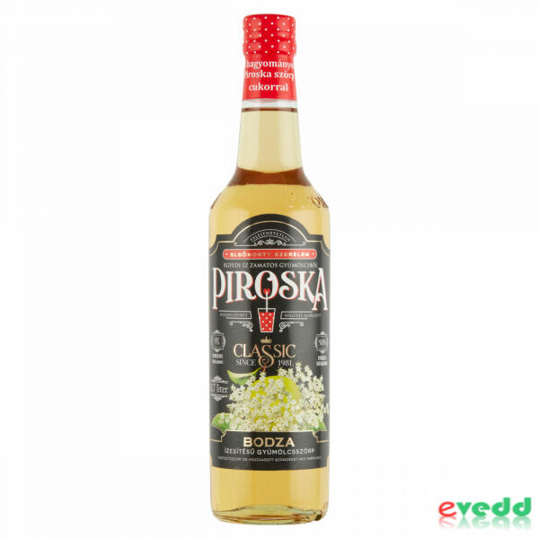 Piroska bodza ízesítésű gyümölcsszörp 0,7 l Hivatalos magyarországi forgalmazótól. Összetevők: Ivóvíz Frukt óz-glükózszörp Almalé 50% (sűrítményből) Étkezési sav (citromsav) Bodzavirág kivonatok 0,6% Édesítőszerek (ciklamátok, aceszulfám-K, szukralóz) Aromák Sűr ítőanyag (xantángumi) Tartósítószerek (kálium-szorbát, nátrium-benzoát) Antioxidáns (aszkorb