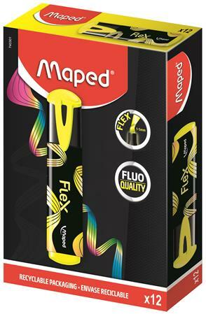 A Szövegkiemelő, 1-5 mm, MAPED Fluo Peps Flex, sárga (IMA740301) "Fluo Peps Flex" - extra hajlékony hegy a tökéletes kiemelésért! -extra rugalmas, puha, vágott hegy -élénk színek -nyomtatott fóliával díszített test -tinta színével megegyező kupak-és tollvég -praktikus klippel ellátott kupak -normál, fénymásoló- és faxpapírhoz is ajánlott -kupak nélkül egy ideig kisz