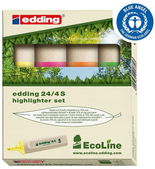 Edding 24 Ecoline 4db-os vegyes színű szövegkiemelő Ecoline szövegkiemelő műanyag alkatrészei a környezet védelme érdekében 90%-nyi újrahasznosított anyagból készülnek, melynek 83%-a a fogyasztóktól származó újrahasznosított műanyag. Ragyogó színű, színtartó, vízálló festékkel töltött, utántölthető szövegkiemelő Vágott csúccsal Vonalvastagság: 2-5 mm