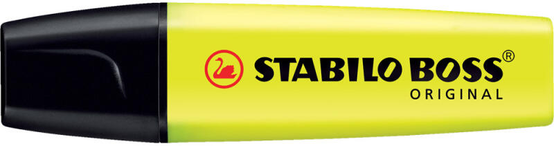 SZÖVEGKIEMELŐ 2-5MM, VÁGOTT HEGYŰ, STABILO BOSS ORIGINAL SÁRGA Vízbázisú tinta. Kétféle (2-5 mm) vastagságú vonalat húz. Kiszáradás elleni technológiájánakköszönhetően akár 4 órán át sem szárad ki kupak nélkül. Tinta színével megegyező tolltest. Katalóguskód: 300