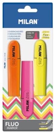 A highlighter a MILAN márkából származik, a FLUO MARKER kategóriába tartozik. Három neon színből álló készlet, például sárga, rózsaszín és narancs. A tinta élénk és gazdag színeket biztosít. A tinta vízbázisú és ékvéggel rendelkezik . A pálya szélessége 1-4,8 mm . Minden típusú papíron használható, beleértve a fénymásolatokat is.