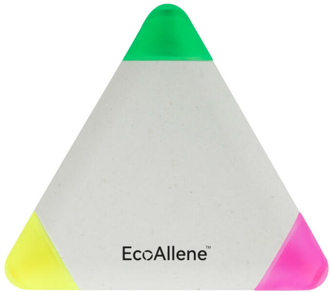 Háromszög alakú szövegkiemelő 3 színnel, EcoAllene® újrahasznosított műanyagból. Az EcoAllene® egy új és innovatív anyag, amely az italos kartondobozok újrahasznosításából származik.