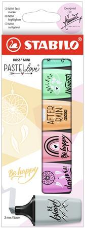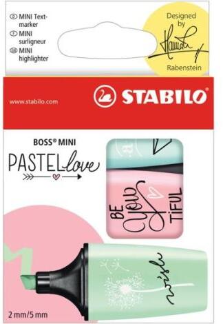Kicsi, de erős: a STABILO BOSS MINI Pastellove egy igazán trendi újdonság, mely már szinte nélkülözhetetlen a pasztell színek rajongói és a kreatív egyéniségek számára. -pasztellszínű, zsebméretű szövegkiemelők Hannah Rabenstein betűművész egyedi rajzaival -STABILO BOSS ORIGINAL szövegkiemelőtől megszokott teljesítménnyel -a kiszáradás elleni technológiának kösz