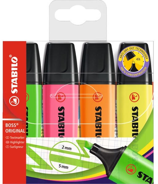 Stabilo BOSS ORIGINAL 4db-os vegyes színű szövegkiemelő - Európa első számú szövegkiemelője - Kiváló kiemelő teljesítmény, hosszú nyitva tarthatósági idő, puha vonal, tartós fluorencia jellemzi - Utántölthető vízbázisú tinta - Vonalvastagság: 2-5 mm - Szett, 4 szín