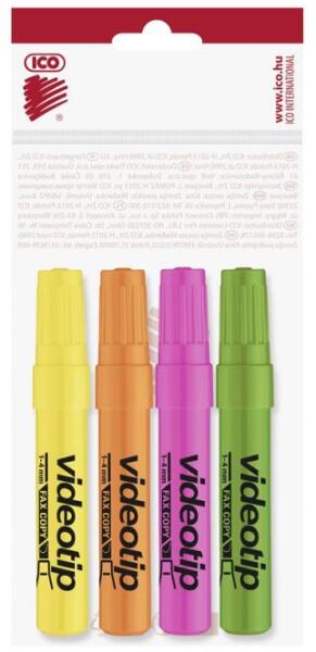 Speciális fluoreszkáló festékkel töltött szövegkiemelõ. A kiemelt szöveg fénymásolható, faxolható. Vágott csúccsal, 4 db-os készletben. Vonalvastagság: 1-4 mm. A készlet sárga, narancs, rózsa és zöld színeket tartalmaz.