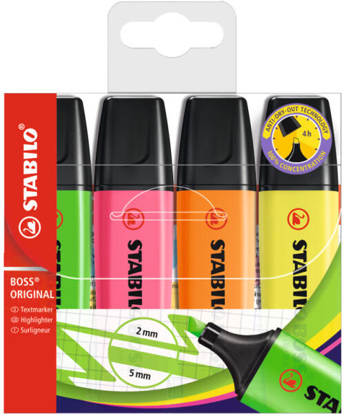 SZÖVEGKIEMELŐ 2-5MM, VÁGOTT HEGYŰ, STABILO BOSS ORIGINAL, 4 KLF. SZÍN Vízbázisú tinta. Kétféle (2-5 mm) vastagságú vonalat húz. Kiszáradás elleni technológiájánakköszönhetően akár 4 órán át sem szárad ki kupak nélkül. Tinta színével megegyező tolltest. Katalóguskód: 244