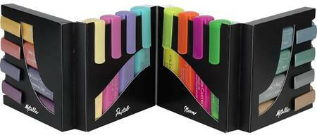 12 ragyogó színkombinációval és kiemelő effektusokkal rendelkező készlet, ami biztosan feldobja a jegyzeteket. - rugalmas, puha, vágott hegy - vonalvastagság: 1-5 mm - ragyogó színek - tinta színével megegyező klippes kupak - normál, fénymásoló- és faxpapírhoz is ajánlott - kupak nélkül egy ideig kiszáradásmentes - 100%-ban újrahasznosítható csomagolás Készletben tal
