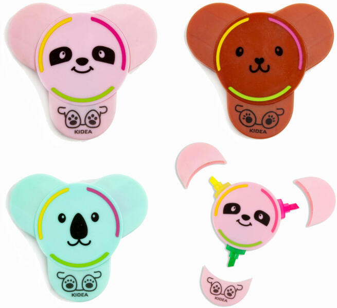 Szövegkiemelő, 3 az 1-ben, 3 féle állatmintával, Kidea. Az ár 1 db-ra vonatkozik. Egy állattal mintázott szövegkiemelő, amely 3 különböző színű szövegkiemelő hegyet tartalmaz. Ezek a cuki szövegkiemelők hasznosak tanulás közben vagy jegyzeteléskor is. Méret: 7x7,5x1,5cm