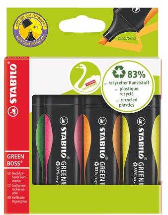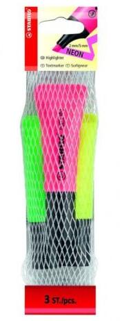 Kiemelő vízbázisú tintával, új csőformában, puha tapadású zónával, kellemesen kezelhető és fogható. A használt STABILO Anti-Dry-Out technológia akár 4 órás védelmet biztosít a tinta kiszáradása ellen, ha a kupak nincs használatban. Vágott hegy, nyomszélesség 2-5 mm. 3 neon színből álló készlet - sárga, narancs, zöld hálóban.