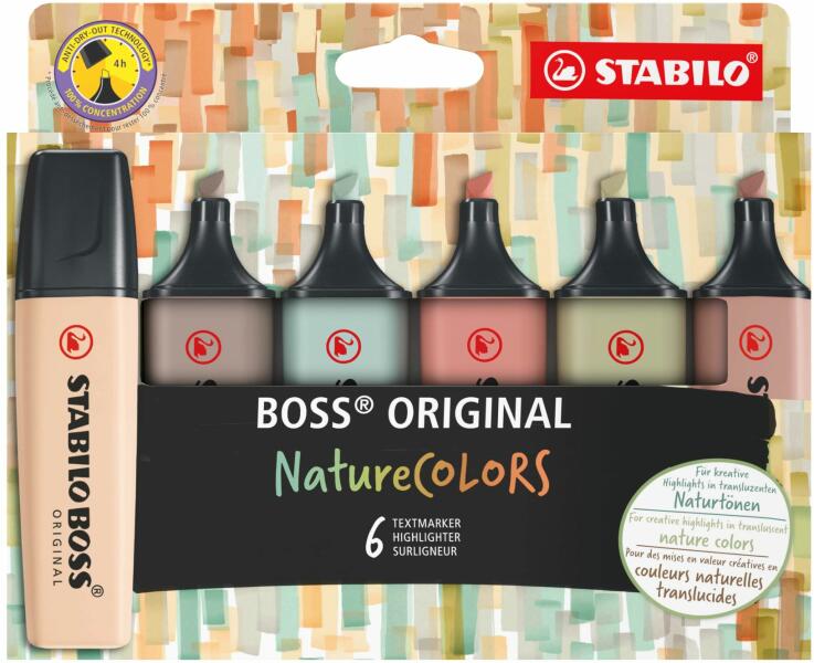 Stabilo Boss Original NatureCOLORS szövegkiemelő klt. 6 db-os (KP) 70/6-2-2 Az ikonikus szövegkiemelők a természet színeiben! -prémium minőségű szövegkiemelő a természet ihlette pasztell színekben -4 órán át nem szárad ki kupak nélkül -vízbázisú tinta, intenzív fedésű színek -vágott hegy (2-5 mm) -a tinta színével megegyező tolltestek -íráshossz darabonként: 350 m