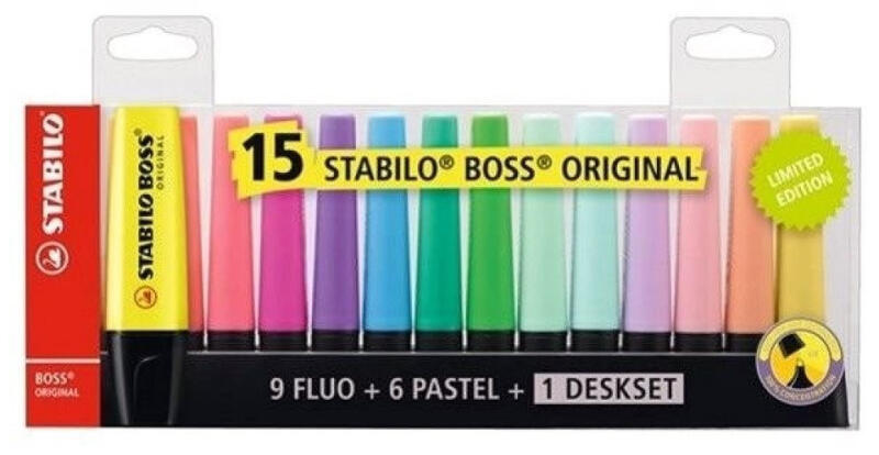 SZÖVEGKIEMELŐ KÉSZLET 2-5MM, VÁGOTT HEGYŰ STABILO BOSS ORIGINAL, 15 KLF. SZÍN Vízbázisú tinta. Kétféle (2-5 mm) vastagságú vonalat húz. Kiszáradás elleni technológiájánakköszönhetően akár 4 órán át sem szárad ki kupak nélkül. Tinta színével megegyező tolltest. Katalóguskód: 42410