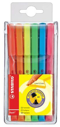 A highlighter a STABILO márkából származik, a FLASH kategóriába tartozik. A Stabilo márka kiáll termékei minősége mellett, ezért a szövegkiemelő kényelmet nyújt az írás során . A highlighter teste keskeny, és van rajta egy klip is. Mindkét dolog jó útitárssá teszi. Hat fluoreszkáló színből álló készlet, például piros, narancssárga, sárga, zöld, kék és rózsas