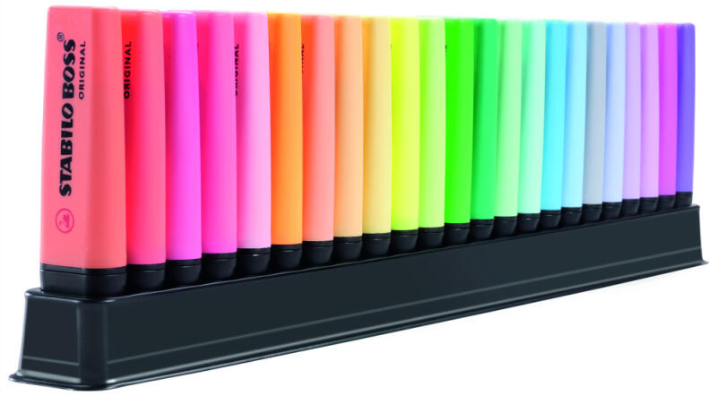 Szövegkiemelő készlet, 2-5 mm, STABILO Boss 50th Birthday 23 klf szín Vízbázisú tinta. Kétféle (2-5 mm) vastagságú vonalat húz. Kiszáradás elleni technológiájának köszönhetően akár 4 órán át sem szárad ki kupak nélkül. Tinta színével megegyező tolltest. Katalóguskód: 46337