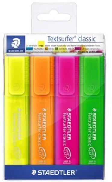 Szövegkiemelő készlet, 1-5 mm, STAEDTLER Classic 364, 4 különböző szín (TS364PWP4) - szövegkiemelő nagy tinta tartállyal az extra hosszú szövegkiemelésért - "Ink Jet Safe": nem kenődik el tintasugaras nyomtatóval nyomott szövegeken és kézzel írott szövegeken - fénymásolható: csak a lila és türkiz színek - használható papíron, faxon és indigós papíron - gyorsan sz