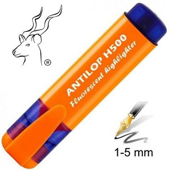 Antilop H500 kiváló minőségű, lapos testű nagy tartályos szövegkiemelő, normál méretű vágott heggyel. A test színe megegyezik az írásszínnel. Írásszín: neon narancssárga. Írás vastagság: 1-5 mm. Kiszerelés: 12 db/doboz