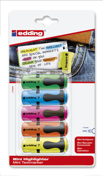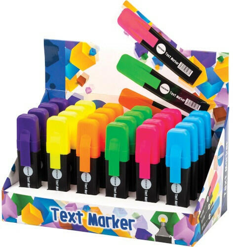 A népszerű gyakorlati kiemelők, az ékhegy, a betűszélesség 1-3 mm, minden típusú papírhoz fluoreszkáló festékkel van feltöltve. A kiszáradás ellenállása 3 év