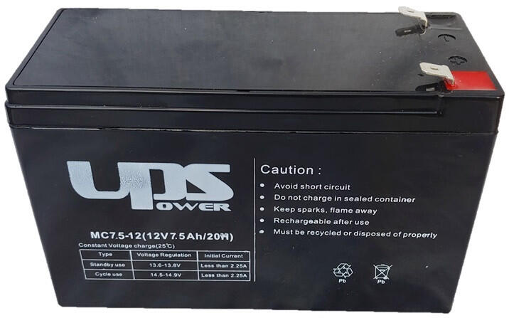 12V 7,5Ah UPS Power T2-es széles sarus zselés akkumulátor Súly: 2,2 kg Alkalmazási terület: Pénztárgép, kommunikációs és számítógépes berendezések, biztonsági és védelmi berendezések, Solar rendszerhez, játékok