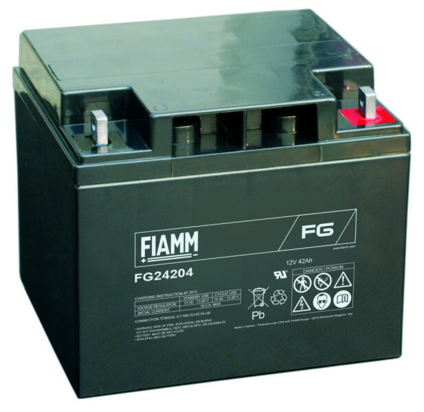 A Fiamm FG24204 12V 42Ah zárt, szivárgásmentes, felitatott elektrolitú, szeleppel vezérelt gázrekombinációs ólomsavas akkumulátor mely akár 1000 ciklus 20%-os kisütési mélységig kisüthető. Teljesen karbantartásmentes, 100%-ban újrahasznosítható 5 éves élettartamra tervezve. Felhasználási terület: szünetmentes (UPS) munka- áramforrás, riasztó- és tűzvédelmi rendszer