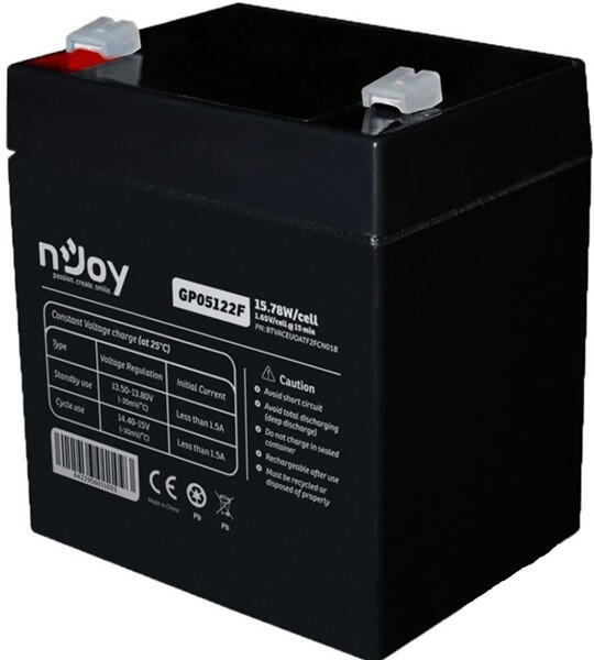 NJOY GP05122F 12V 5Ah Akkumulátor zárt, gondozásmentes AGM Teljesen zárt és karbantartásmentes Több mint 260 ciklus 100% DOD mellett Normál használat: 3-5 év Alacsony önkisülés Csatlakozók: T2 (F2) Alkalmazható a következő eszközökben - Riasztó - Biztonsági rendszer - Kábel tv - Kommunikációs berendezések - Orvosi felszerelés - UPS - Elektromos szerszámok - Vezérlő ber