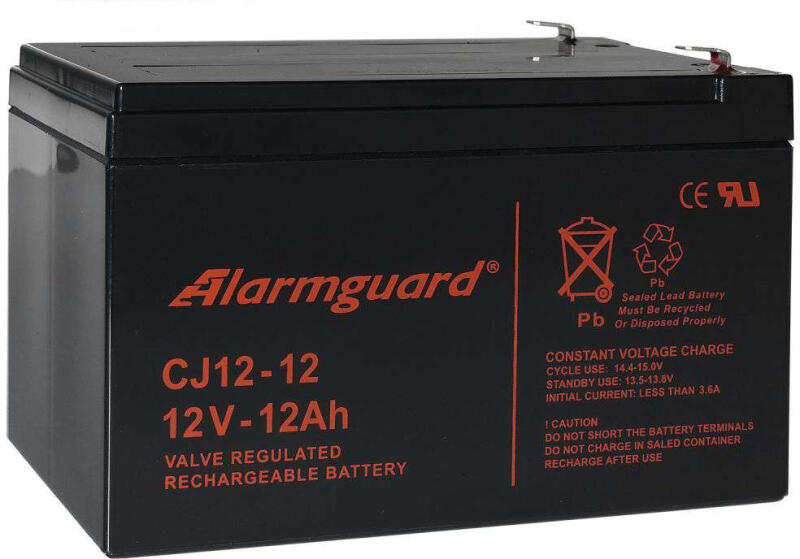 Alarmguard CJ12-12 12V 12Ah-s zártrendszerű, AGM technológiás, szeleppel vezérelt (VRLA), ismételten újratölthető gondozásmentes (zselés) ólomsavas akkumulátor. Szigetelt tömítéssel vízszintes, függőleges és oldalsó irányban is elhelyezhető így biztonságát és funkcióit ez nem befolyásolja. Várható élettartama 3-5 év (Standby - Készenléti üzemmódban 5 év), mely