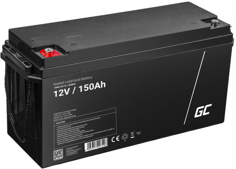 Feszültség: 12V | Kapacitás: 150Ah | Jótállás: 24 hónap | Típus: VRLA AGM | Termék kód: AGM32 | Gyártó: Green Cell | Méret: 485 x 172 x 240 mm | Súly: 42.5 kg | Csatlakozás: M8 csavar | Élettartam: 5 év felett | Önkisülés: 2% egy hónap alatt (25 °C-on) | Kapacitás hőfok: (40°C - 102%) (20°C - 100%) (0°C - 85%) (-15°C - 65%) | Puffer betöltése: 13.5-13.8V (-20mV/C) | C