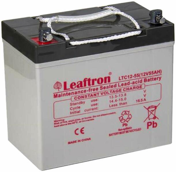 Leaftron LTC12-55 VLRA AGM zselés, szünetmentes akkumulátor 12V 55Ah UPS-ben is használható, és párban alkalmas elektromos kocsik (kerekes székek és mások) meghajtására. Az LTC akkumulátor sorozat széles körű felhasználásra készült. Az akkumulátorok 1600 kisütési ciklusig vagy 10 évig használhatók "Készenléti-Stand By" módban. A többi Leaftron akkumulátorhoz hasonló