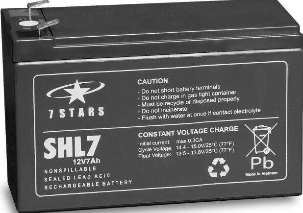 A 7 Stars SHL7-12 egy 12V-os, 7Ah kapacitású zárt ólom-savas (VRLA) akkumulátor, amelyet széles körben használnak szünetmentes tápegységekhez (UPS), riasztórendszerekhez, vészvilágításhoz, és más kis- és közepes energiaigényű alkalmazásokhoz. Főbb specifikációk : Feszültség : 12V Kapacitás : 7Ah Technológia : Zárt, karbantartásmentes ólom-savas (VRLA) Jellemzők :