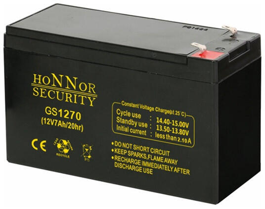 Honnor Security HS12-7 12V/7Ah zárt gondozásmentes AGM akkumulátor AGM akkumulátor, 12 V, 7Ah, 151 x 65 x 95 mm, 2 kg, zárt, gondozásmentes. Normál tápegységekhez.